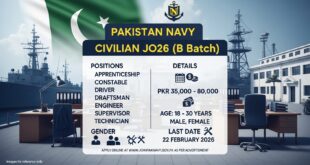 Pak Navy Civilian Jobs 2026 – B Batch Apply Online | www.joinpaknavy.gov.pk Pakistan Navy has officially announced Pak Navy Civilian Jobs 2026 (B Batch), offering a wide range of employment opportunities for eligible candidates across Pakistan. These vacancies are open for both male and female applicants who are hardworking, physically …