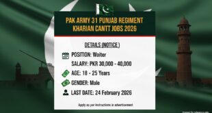 If you are looking for a respected government job in Pakistan with stability, honor, and career growth, the Pak Army 31 Punjab Regiment Kharian Cantt Jobs 2026 offer an excellent opportunity. These latest vacancies have been announced through the Nawaiwaqt newspaper, inviting hardworking and disciplined young candidates to apply. Pakistan …